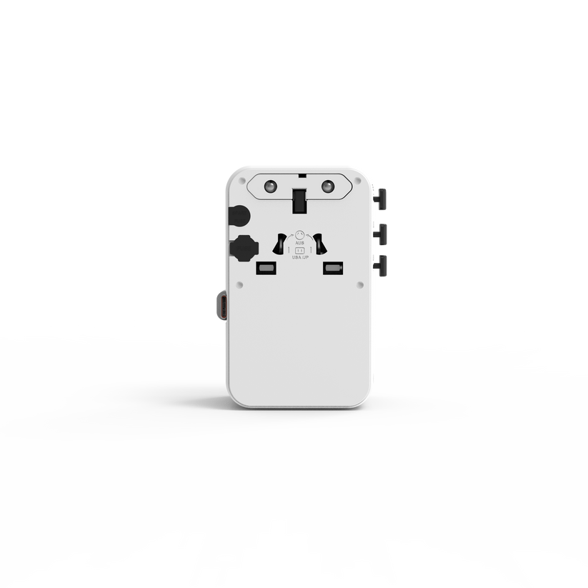 An all-in-one worldwide travel adapter with 4 plug types compatible with outlets in 200+ countries (Type C, G, I, A; not for Type D or M). It features 3 USB-C ports, 1 USB-A port, and 1 AC outlet, supporting PD 3.0 and QC 3.0 fast charging up to 45W on USB-C. Built with safety shutters, a 10A fuse, and fire-resistant materials, it is RoHS, CE, and FCC certified. The adapter converts plug types only (not voltage), so dual-voltage devices are required. Compact, lightweight, cruise-ship-friendly, and includes a carrying pouch—ideal for travel and everyday use.